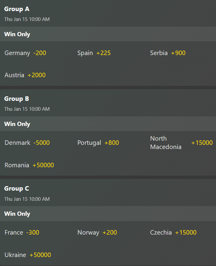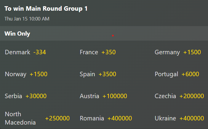 At a top level major handball tournaments are starting to feel a bit like the Liga ASOBAL with Denmark playing the role of Barcelona. And, with the exciting question be who will get 2nd place. Of course, that’s just what it “feels” like and Denmark actually hasn’t won the European Championship since 2012. So, we’ll see if the curse continues or whether Denmark is doubly motivated to win it again. For sure, the betting odds have them as heavy favorites at -300 or 1/3 odds or a 75% implied chance to win the tournament