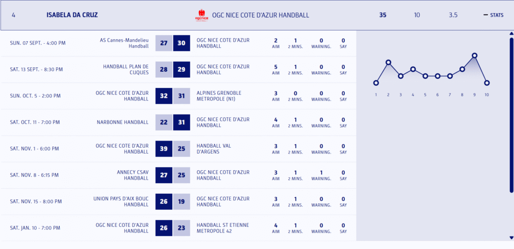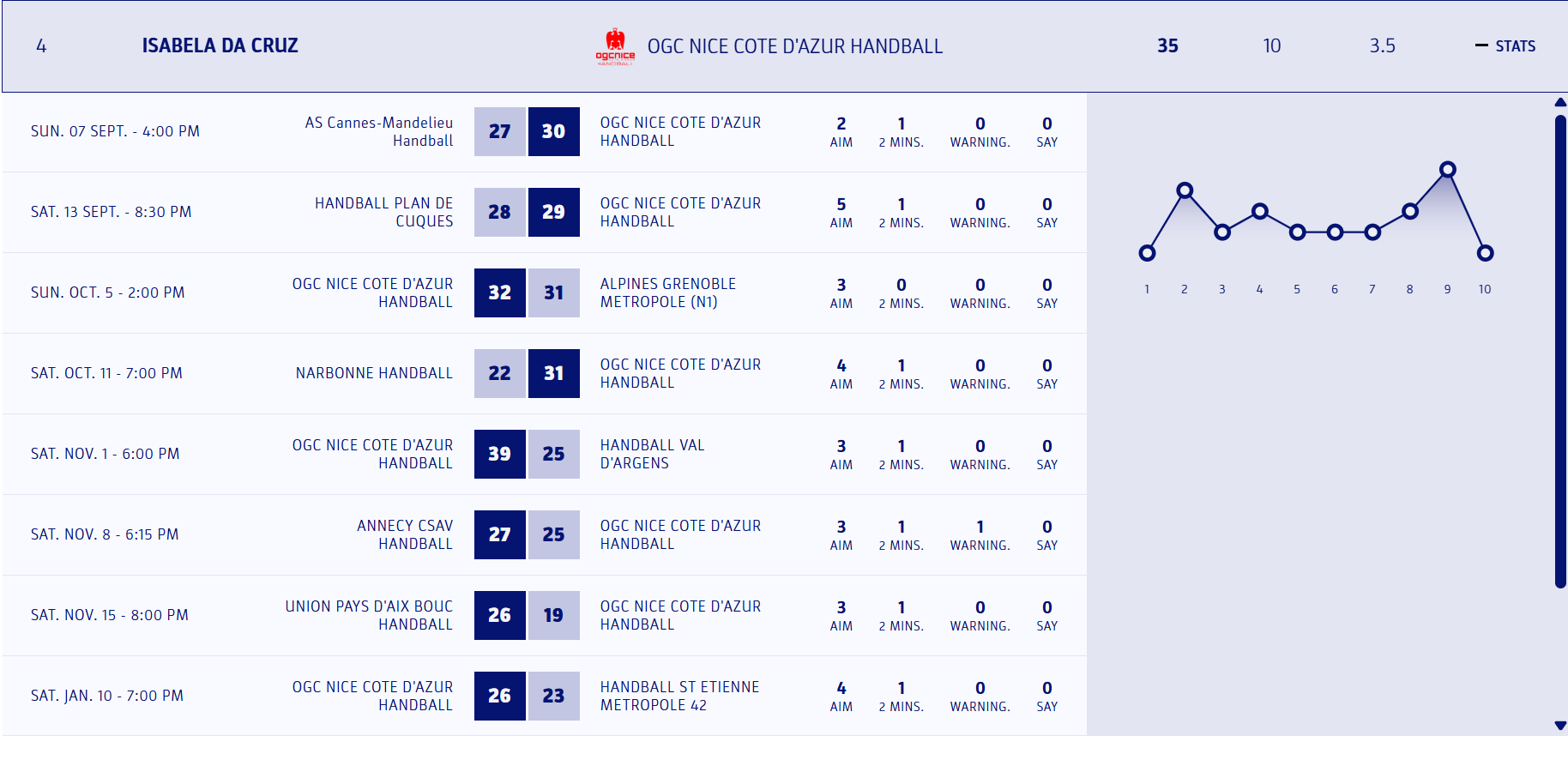 OGC Nice’s 1st team is currently in 5th place in the Butagaz Energy League and Da Cruz plays behind the team’s leading scorer, French International player Marie-Helene Sajak. Da Cruz who is 19 years old and turns 20 later this month gets most of her current playing time with OGC Nice’s 2nd team which plays in NF1, the 3rd level of French Women’s handball. For the 2nd team she has 35 goals in 10 matches for a 3.5 goals/game average. (See Below)