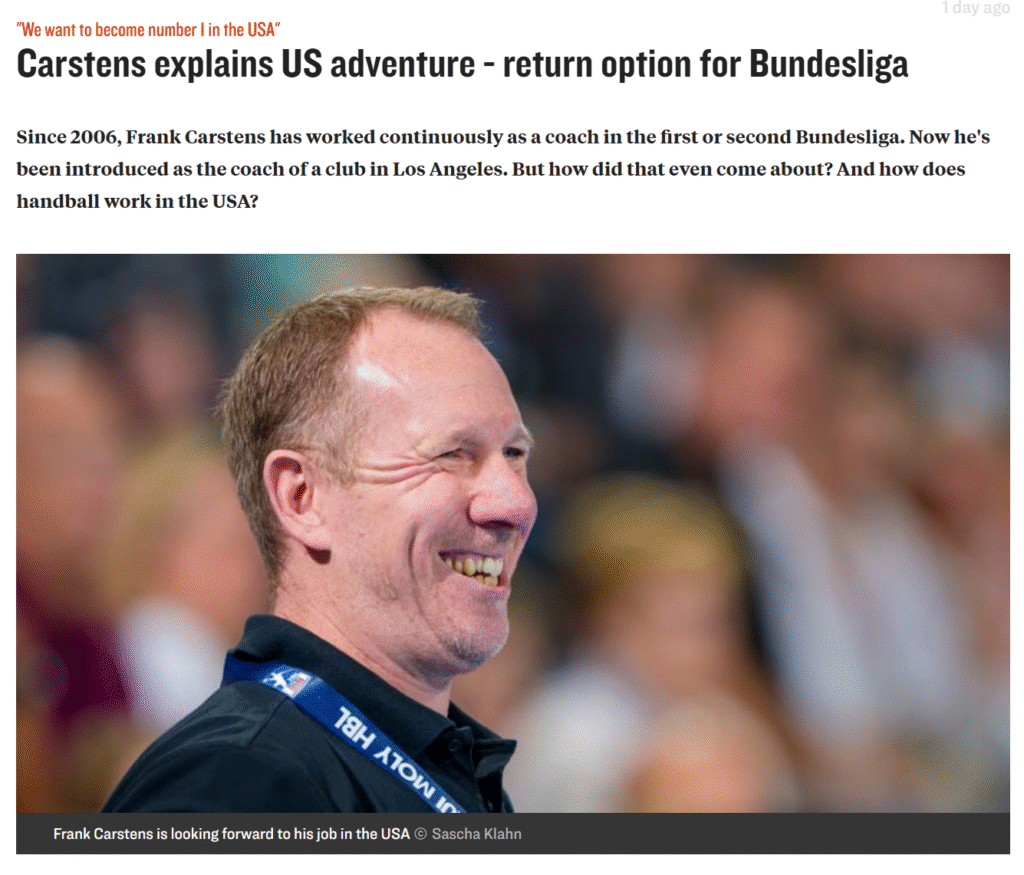 On helping handball in the USA: Carstens seems to have a good perspective on this. Like many in the handball world he understands the importance of growing the U.S. market, but he also notes that his involvement is perhaps “a small step in that direction.” He’s certainly right about that. Having an experienced coach a club handball team in the U.S. sounds cool, but it can only accomplish so much.