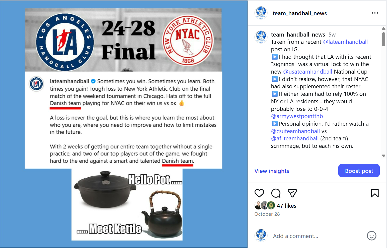 80 years later a different talent acquisition battle is taking place on American handball courts. This time two teams, the Los Angeles Team Handball Club (LA THC) and the New York Athletic Club (NYAC) have both “acquired” European handball players to bolster their prospects of winning the USA Team Handball National Cup. Initially, I thought that only LA THC was bolstering their roster with Viran Morros and Domogoj Srsen coming from Europe along with most of the upper echelon handball athletes (Drew Donlin, Ty Reed, and Akuro Zuwed) living in the U.S. joining the team. But, then NYAC suprised LA THC at the first weekend of competition in October. This is because NYAC had very quietly added some Danish Handballers to augment their roster. LA THC lacked backcourt scoring and NYAC beat them 28-24 and whined about losing to a “Danish team.” I found this to be amusingly hypocritical and posted this on Instagram.